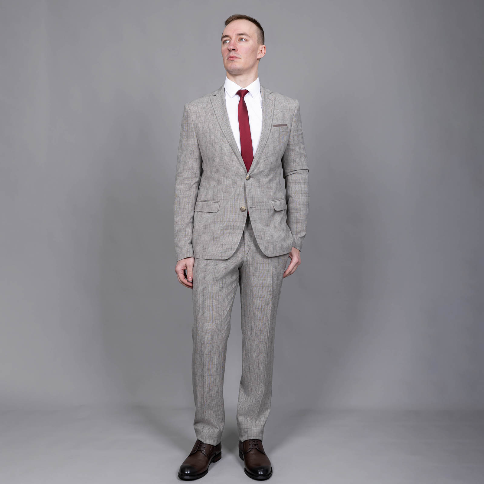 Классический костюм двойка в светло бежевом цвете сочетает в себе классический крой и современные тенденции. Деликатный клетчатый узор на ткани пиджака – добавляет нотку индивидуальности, при этом не перегружая образ.