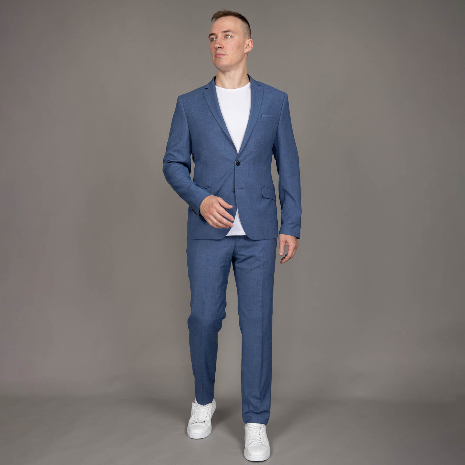 Голубой цвет костюма — это отличная альтернатива традиционным тёмным оттенкам, он придаёт образу лёгкость и свежесть, а также хорошо сочетается с разнообразными цветами и аксессуарами. Такой костюм можно дополнить как классическими туфлями, так и более повседневной обувью, в зависимости от ситуации.