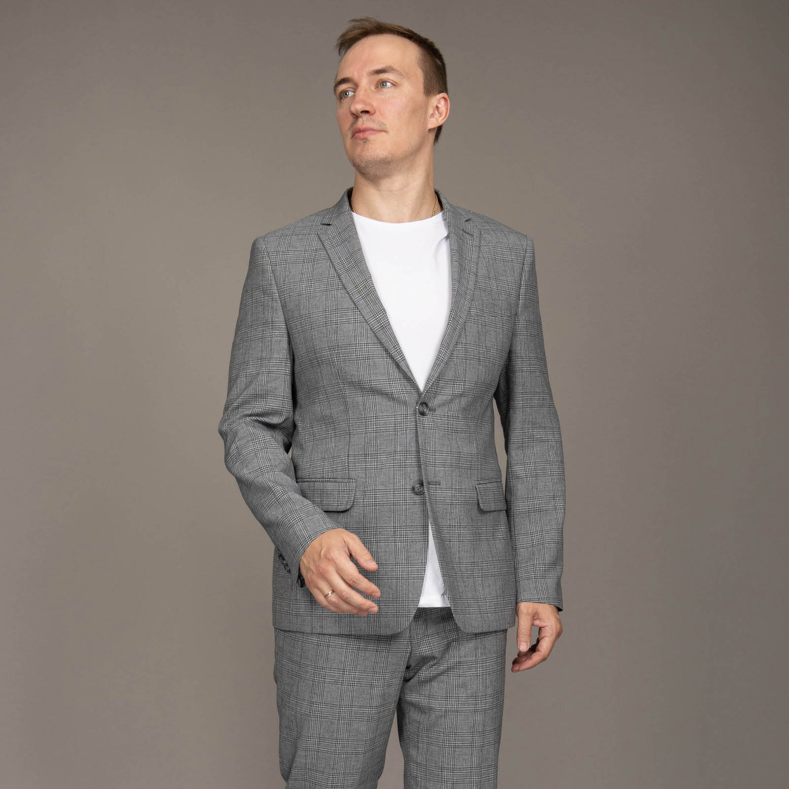 Представляем классический мужской костюм, серого цвета с элегантным и аккуратным клетчатым рисунком ткани. Клетка предает костюму характер и глубину, оставаясь при этом в рамках делового дресс-кода.
