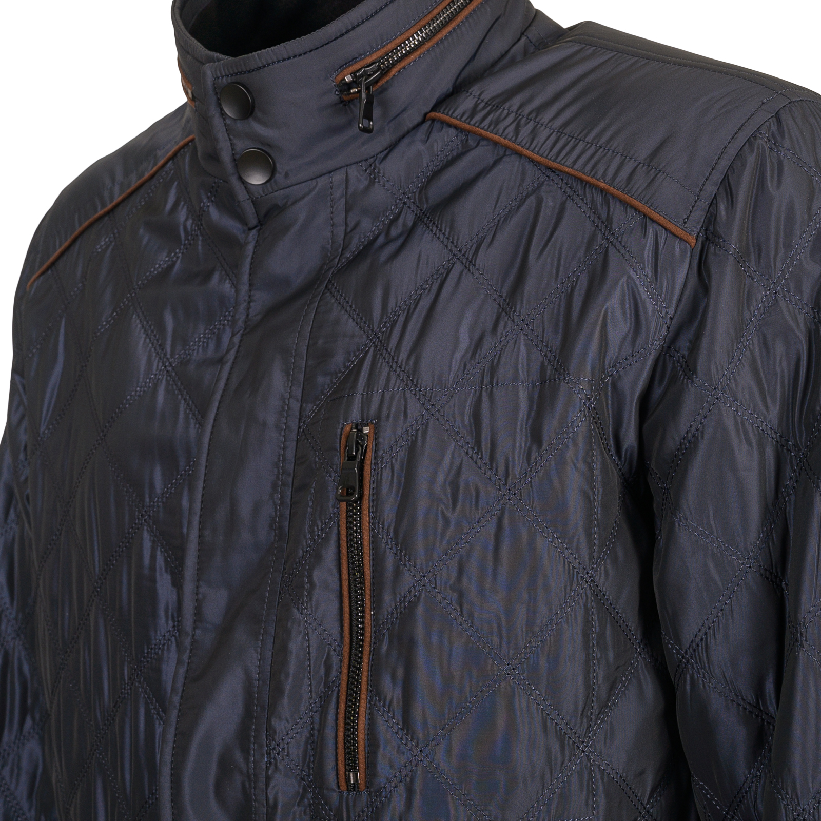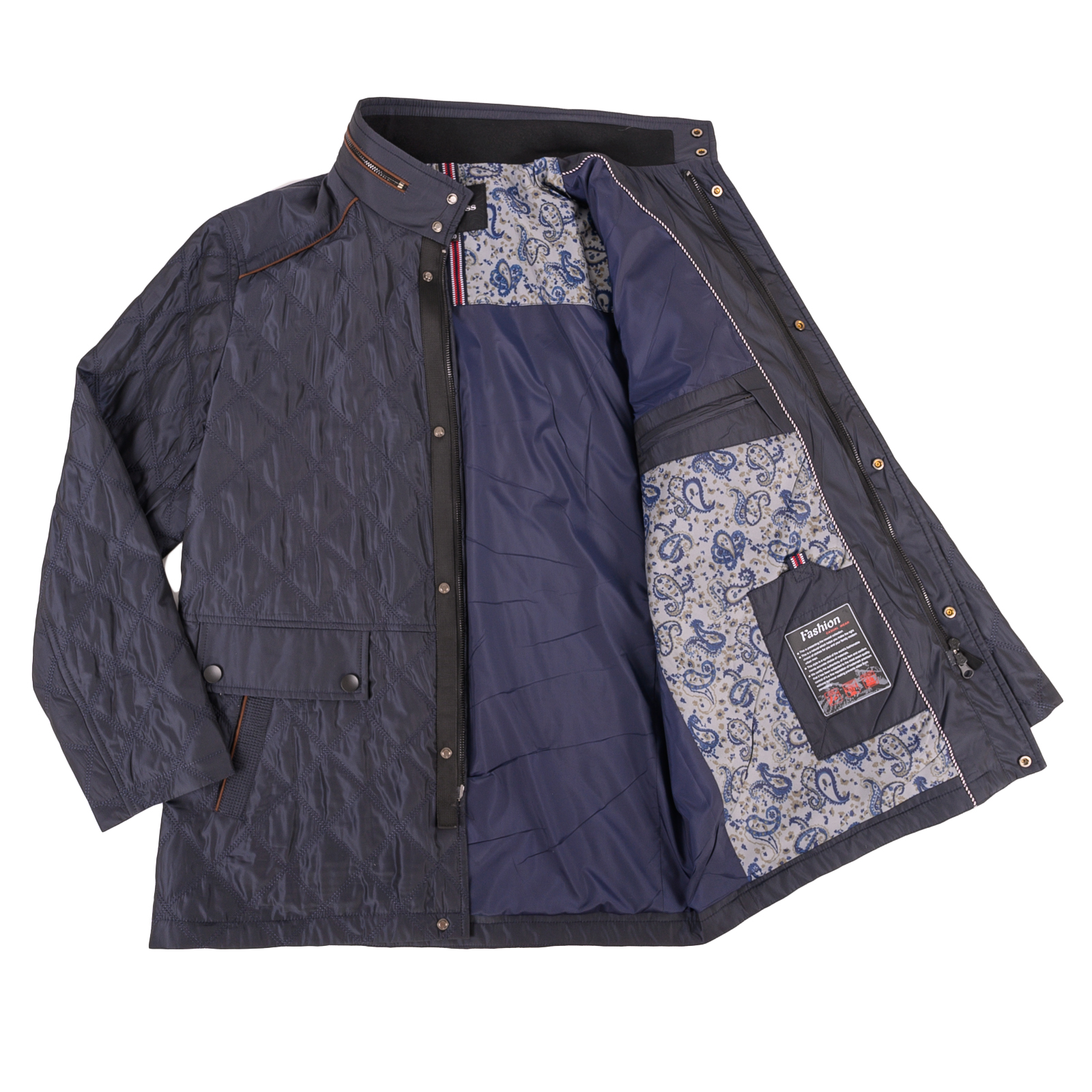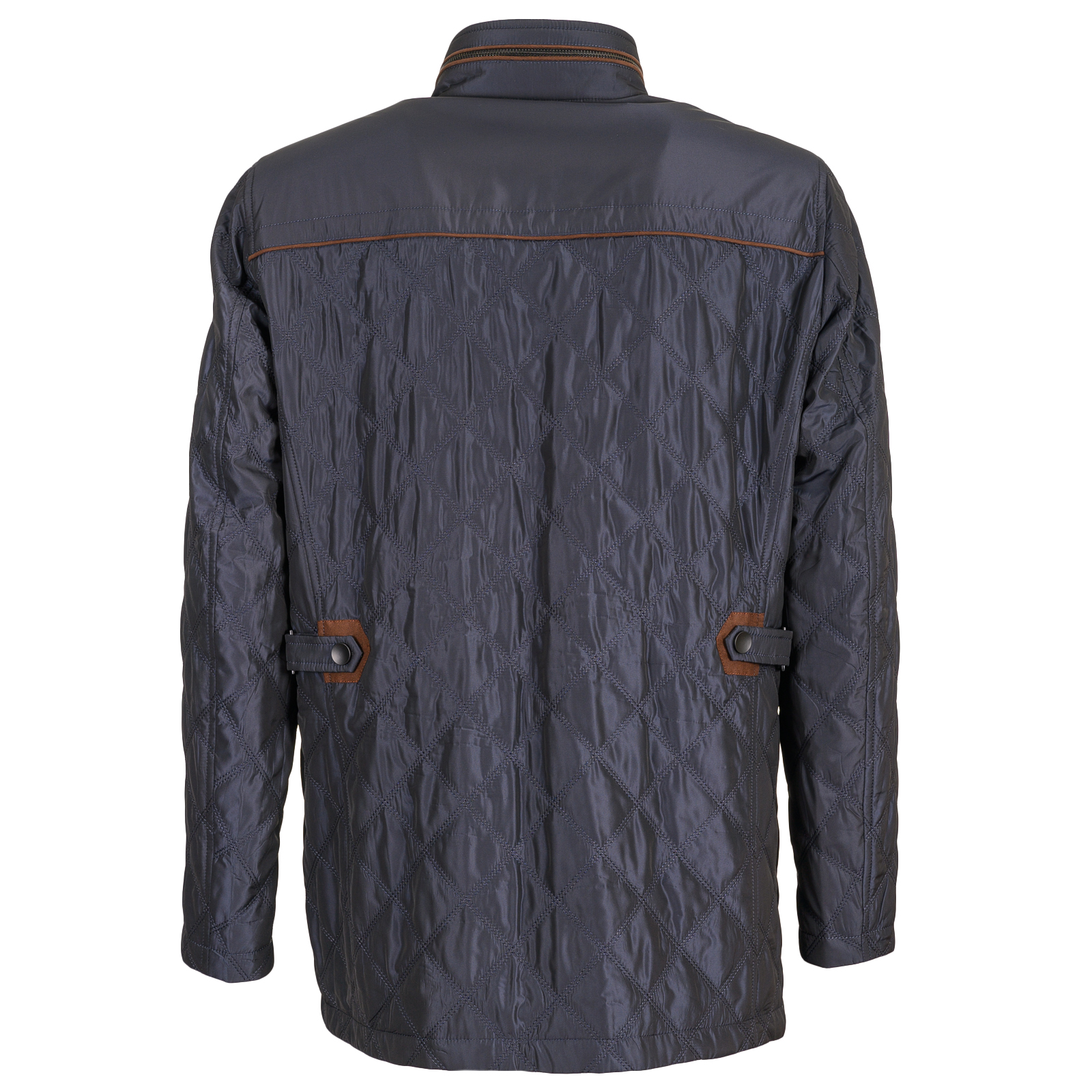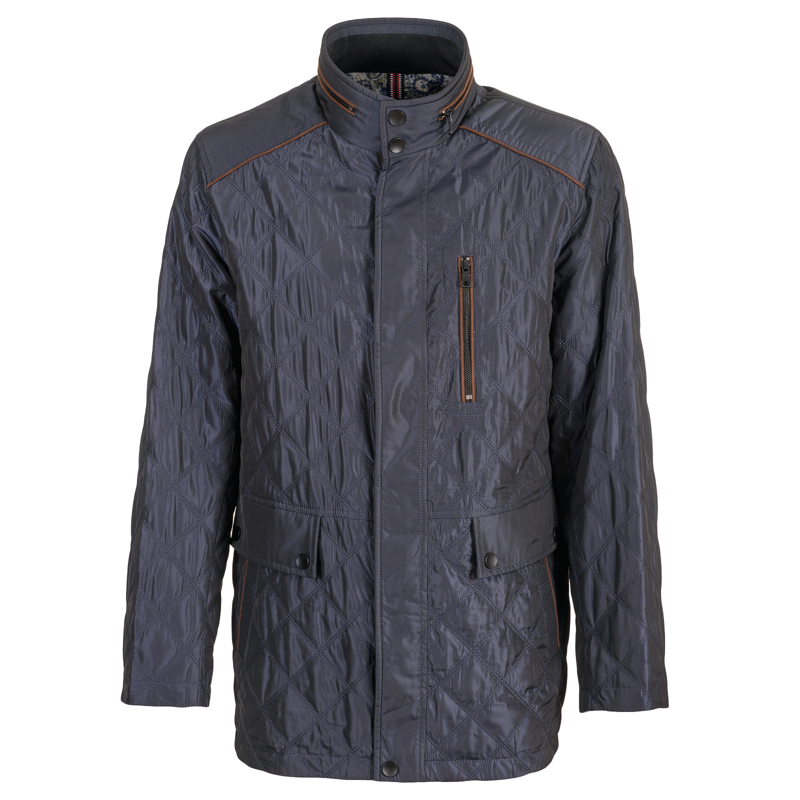 Утепленная удлиненная куртка на сезон «весна-осень» синего цвета. Изощренный фасон: крупная простежка в клетку, контрастная окантовка воротника, карманов, кокетки полочки и спинки, паты на линии талии, оригинальная двухцветная подкладка. Эти детали не оставят равнодушными мужчин, которые следят за модой. Состав: Верх:100%полиэстер;Подклад:100%полиэстер.